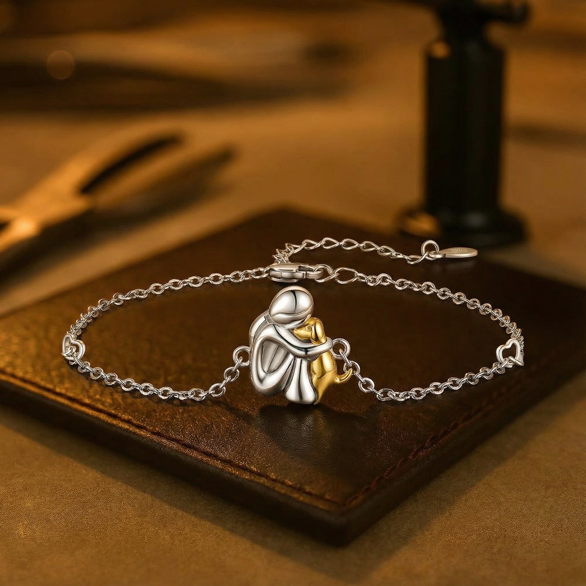 Tento jemný náramek je něžnou připomínkou lásky, která vás nikdy neopustí. Malý design ženy a jejího psa zachycuje teplo, loajalitu a tichou spojitost. Lehké a pohodlné, může být nošeno na zápěstí nebo kotníku — přidává měkký dotek významu do každého dne.
